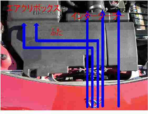 空気の通り道 図の矢印の通りである。 まっすぐの矢印はインタークーラーの冷却。 MAZDAと書いてある黒い物体がエアクリボックスであるが、 そこまでに一度「ふた」の中を通ってからエアクリボックスへと空気が流れる。 これはなんとも吸気損失の大きそうなレイアウトである。 どうにかしてこのふたを通らずにエアクリへと空気を導けないものか?