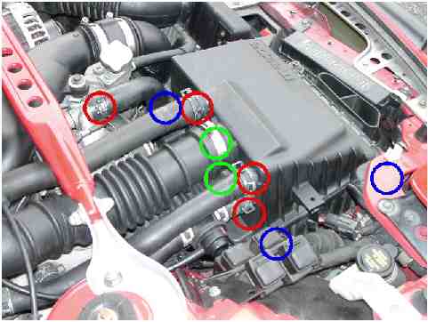 青丸は10mmのボルトです。一番左上の青丸のボルトは付ける時に 落とさない様に注意してください。
